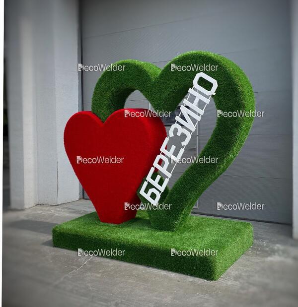 В основе композиции лежит металлический каркас, покрытый прочным стеклопластиком и декорированный искусственным газоном красного и зеленого цвета.