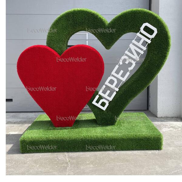 Буквы выполнены из металла и покрыты антикоррозийным полимером и декорированы искусственным газоном белого цвета.